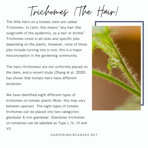 The little hairs on a tomato stem are called Trichomes. In Latin, this means “any hair-like outgrowth of the epidermis, as a hair or bristle”. Trichomes come in all sizes and specific jobs depending on the plants. However, none of those jobs include turning into a root, this is a major misconception in the gardening community.